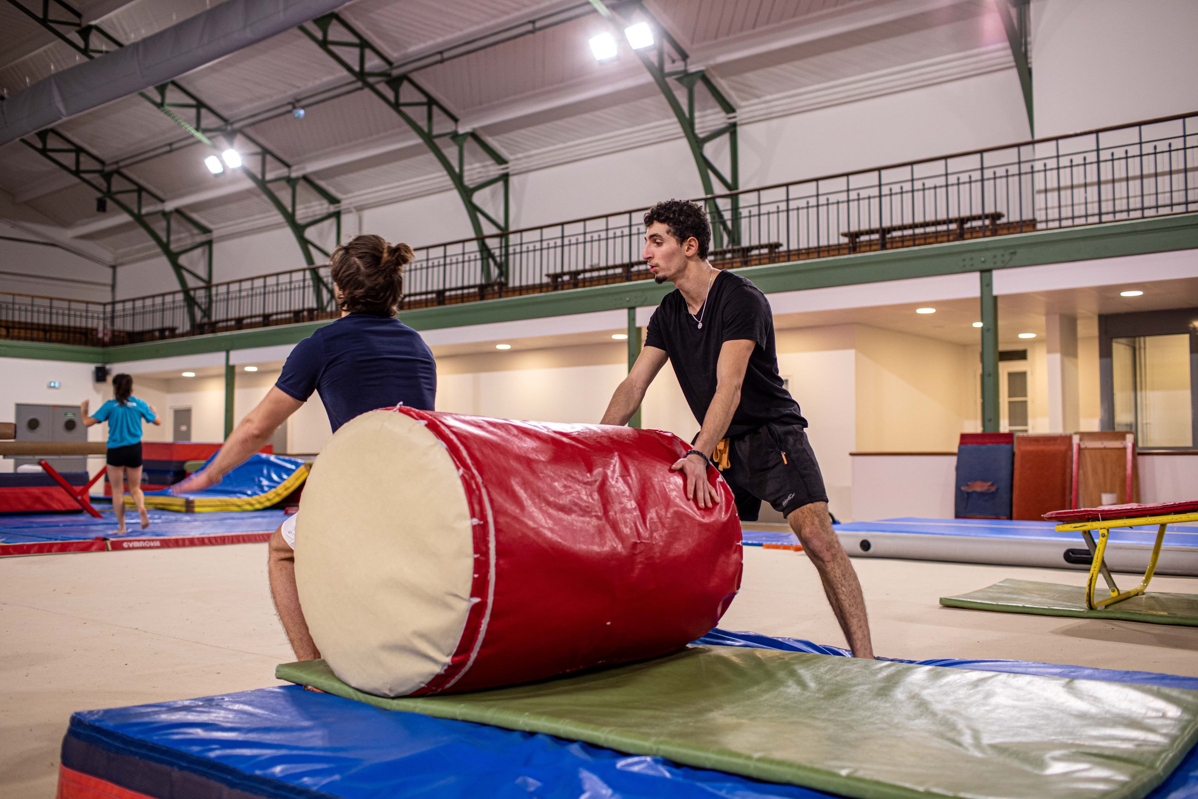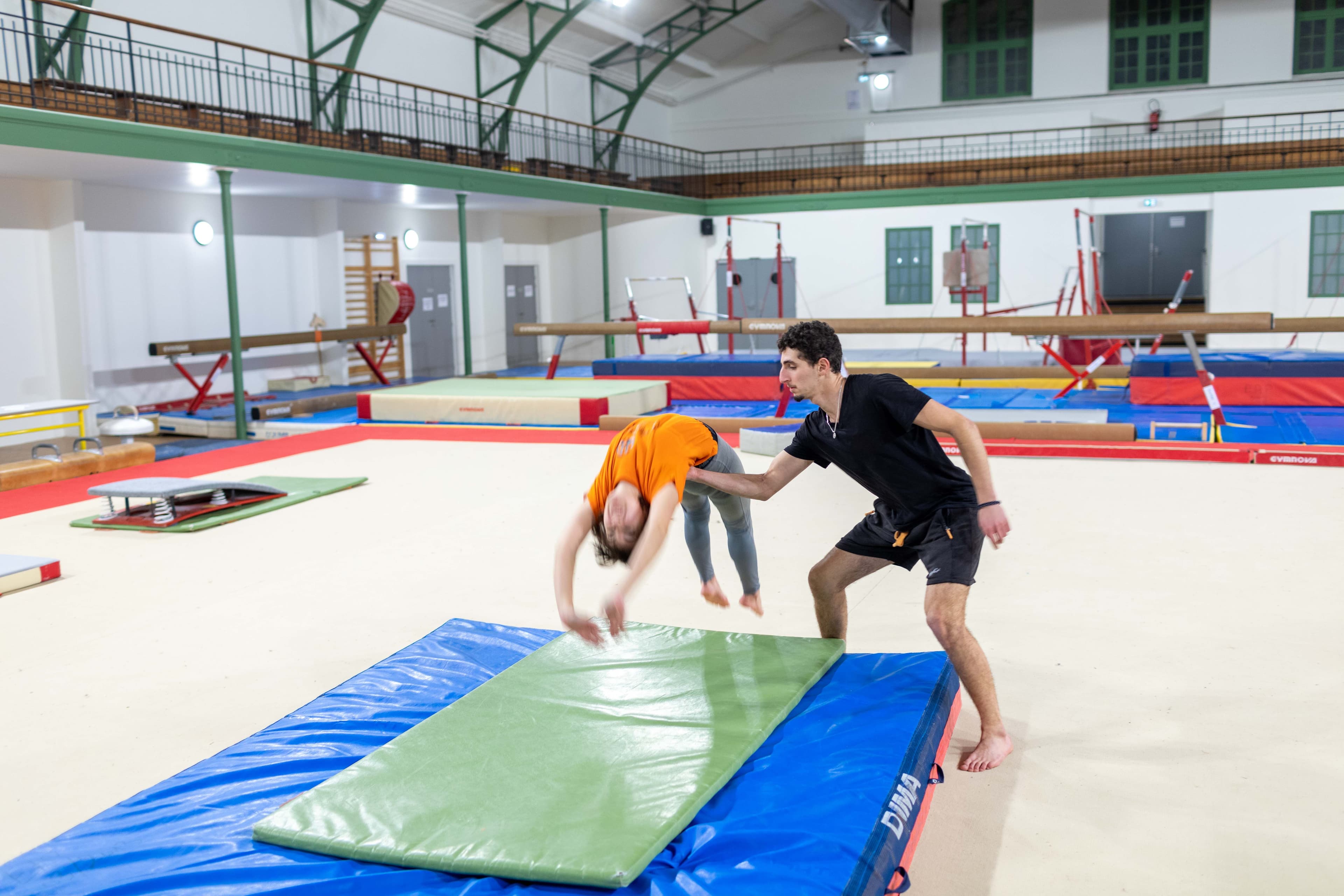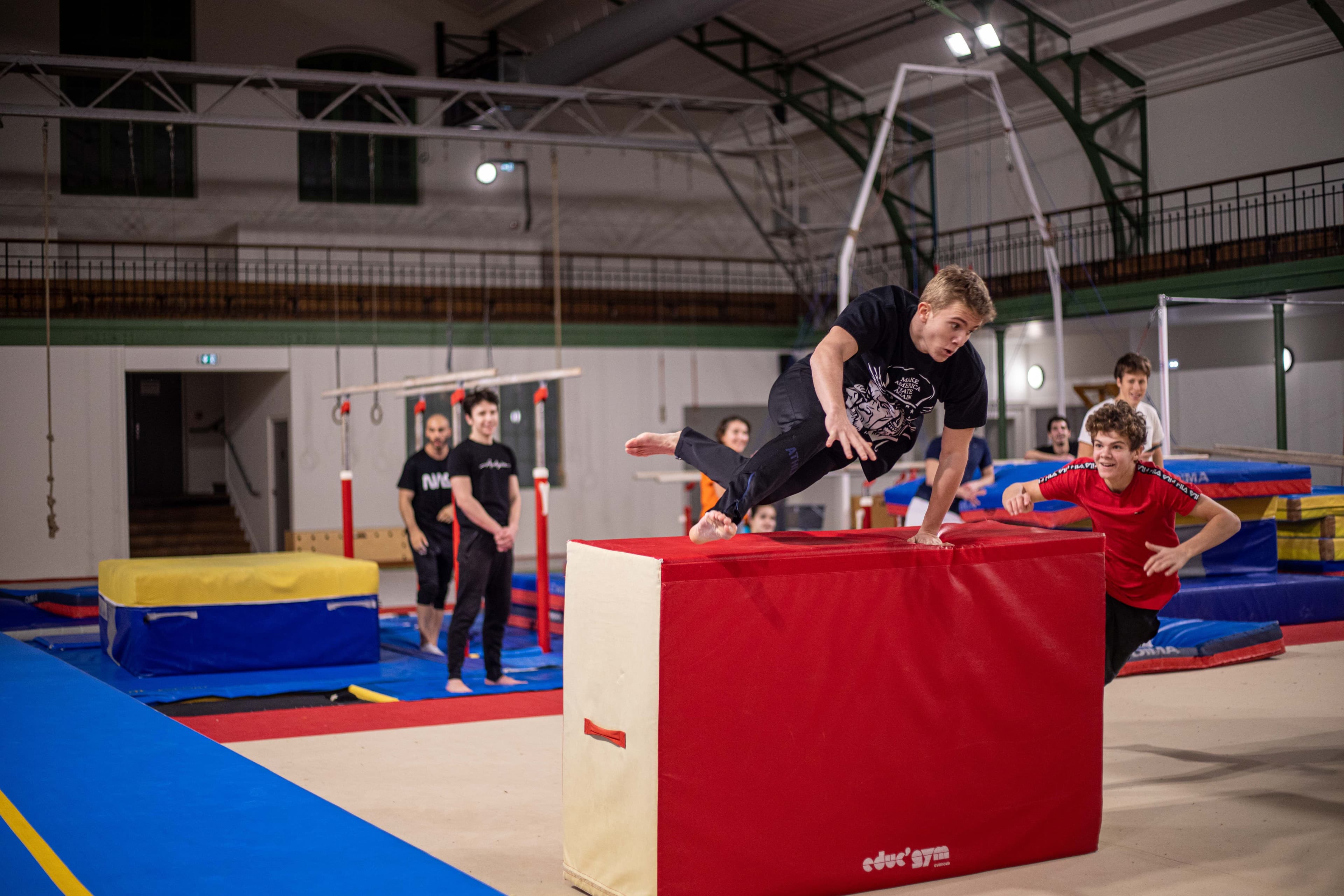 Tu peux utiliser toutes les installations (agrès, matelas et fosses de réception, trampolines et salle de muscu) quel que soit ta pratique : parkour, tricks, cheerleading…